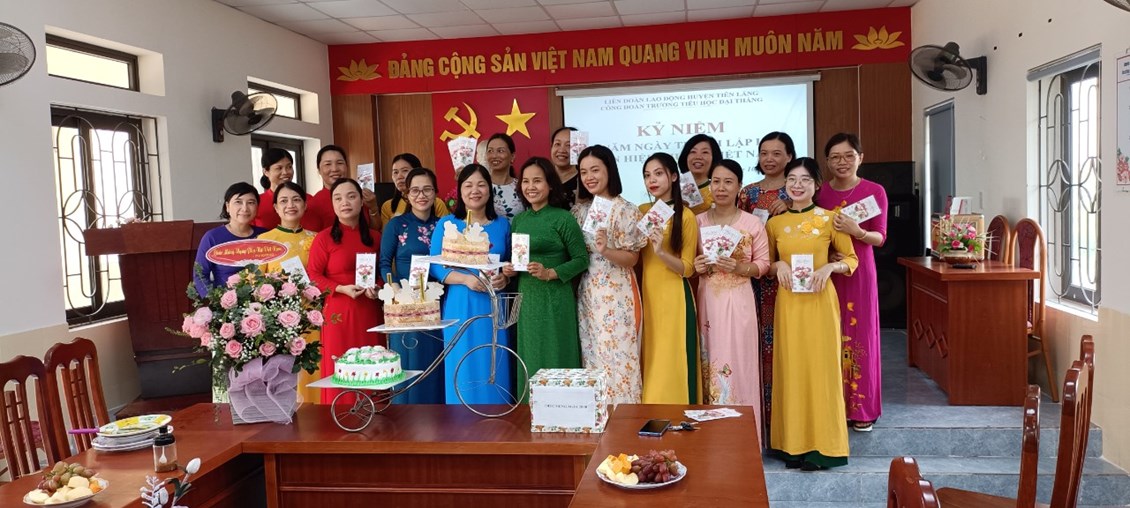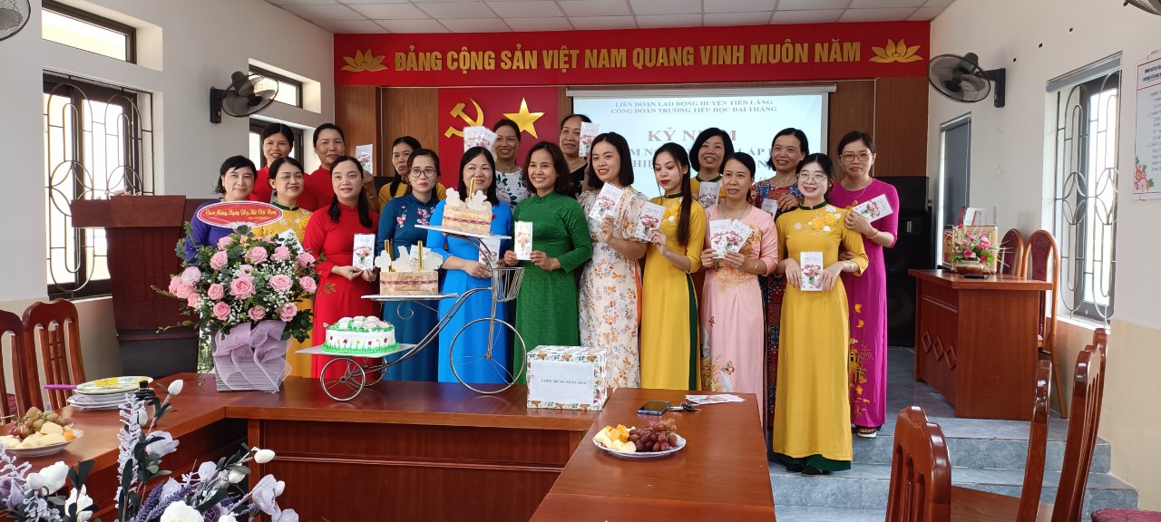 Chiều ngày 20/10/2023, Công đoàn trường TH Đại Thắng phối hợp cùng nhà trường tổ chức Kỷ niệm Ngày thành lập Hội liên hiệp phụ nữ Việt Nam 20-10. Đây là hoạt động mang ý nghĩa, thể hiện sự quan tâm, chăm lo đời sống tinh thần CĐV của Công đoàn và nhà trường.