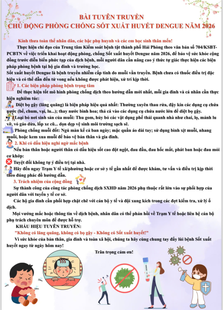 Thực hiện chỉ đạo của Trung tâm Kiểm soát bệnh tật thành phố Hải Phòng theo văn bản số 704/KSBT-PCBTN về việc triển khai hoạt động phòng, chống Sốt xuất huyết Dengue năm 2026, để bảo vệ sức khỏe cộng đồng trước diễn biến phức tạp của dịch bệnh, mỗi người dân cần nâng cao ý thức tự giác thực hiện các biện pháp phòng bệnh tại hộ gia đình và trường học.