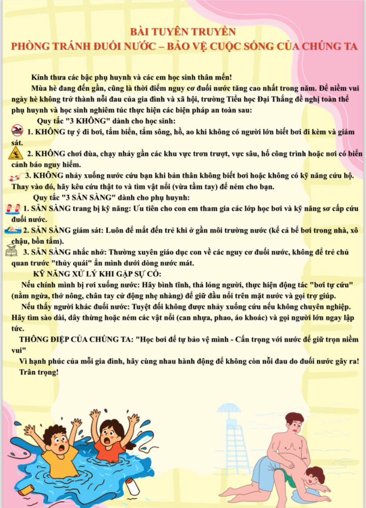 Mùa hè đang đến gần, cũng là thời điểm nguy cơ đuối nước tăng cao nhất trong năm. Để niềm vui ngày hè không trở thành nỗi đau của gia đình và xã hội, trường Tiểu học Đại Thắng đề nghị toàn thể phụ huynh và học sinh nghiêm túc thực hiện các biện pháp an toàn sau: