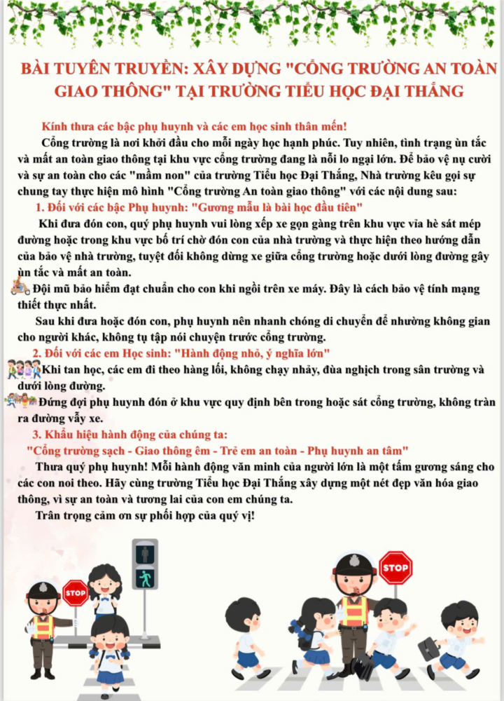Thưa quý phụ huynh! Mỗi hành động văn minh của người lớn là một tấm gương sáng cho các con noi theo. Hãy cùng trường Tiểu học Đại Thắng xây dựng một nét đẹp văn hóa giao thông, vì sự an toàn và tương lai của con em chúng ta.