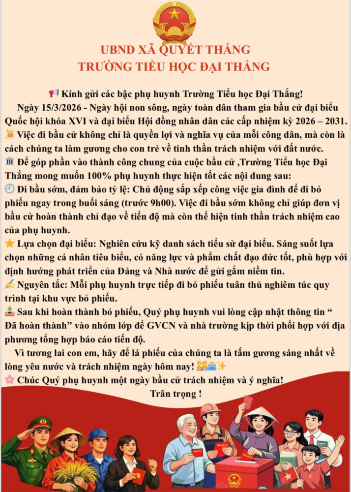 Thực hiện chủ trương của Đảng và Nhà nước về việc tổ chức bầu cử đại biểu Quốc hội khóa XVI và đại biểu Hội đồng nhân dân các cấp nhiệm kỳ 2026 – 2031, Trường Tiểu học Đại Thắng trân trọng tuyên truyền và kêu gọi toàn thể cán bộ, giáo viên, nhân viên, các bậc phụ huynh học sinh và nhân dân trên địa bàn tích cực tham gia ngày hội lớn của toàn dân.